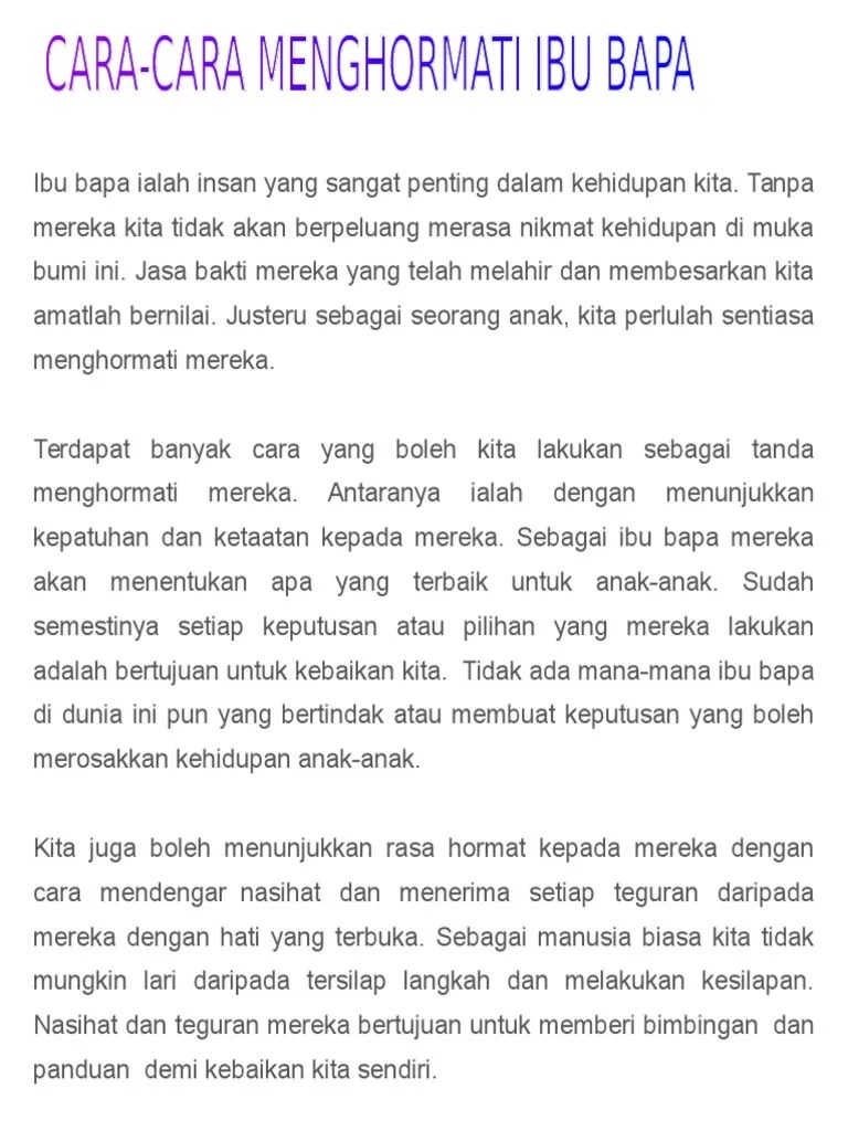 Cara menghormati ibu bapa Karangan UPSR UPSR. Beruntunglah jika anda mempunyai seorang anak yang baik akhlaknya tidak merungut akan kesusahan ibu bapa sering membantu ibu bapa dan sentiasa mengamalkan nilai-nilai murni yang lain. Contoh Karangan SPM CARA-CARA MENGHARGAI WARGA TUA Warga tua merujuk kepada mereka yang berusia lebih daripada 60 tahun.